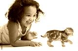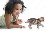 Happy kid girl playing with kitten