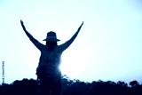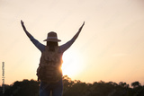 Women raise their hands at sunset in warm light,Woman hiking on mountains at sunny day time,Freedom and adventure concept