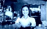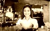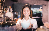 Asian woman barista smiling with a cup of coffee in her hand,Coffee salesmen deliver coffee to customers