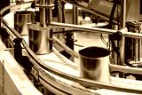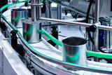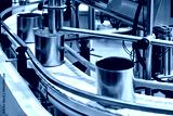 Canned food products on conveyor belt in distribution warehouse.food transportation system concept