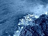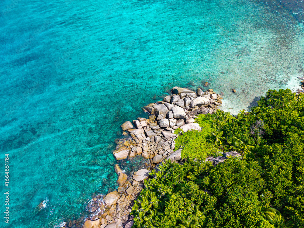 Seychelles aerial view, La Digue and Praslin. Sharp granite rock formations, transparent turquoise waters, and tropical shoreline. Exotic landscape.