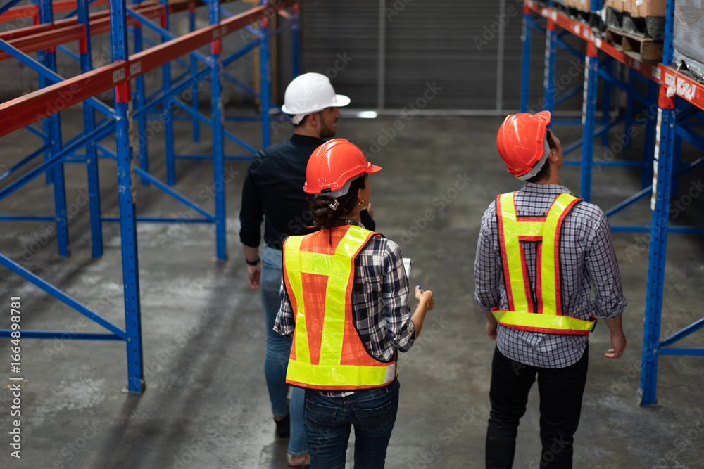 Team of warehouse workers inspecting inventory in a logistics facility. Represents supply chain management, stock control, and professional collaboration