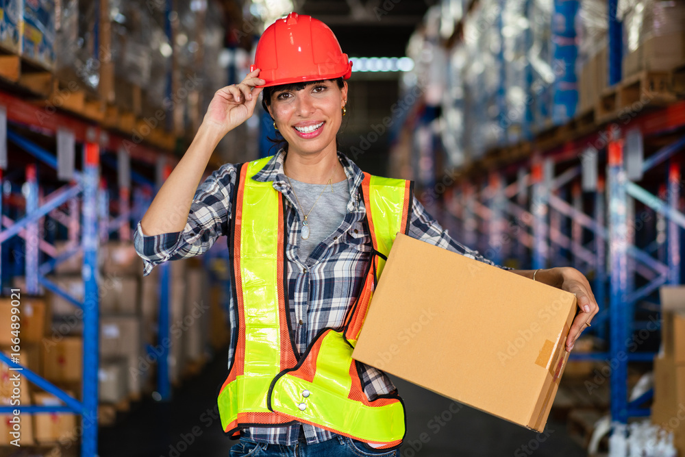 Smiling female warehouse worker with vision in safety gear holding a box. Represents logistics, hard work, professional service, and women in industry