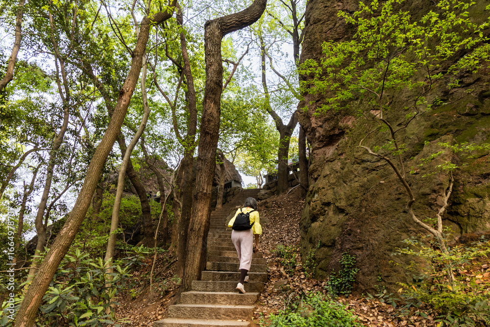 Hiker hiking the serene Boshi hill near West Lake in Hangzhou, China
