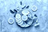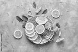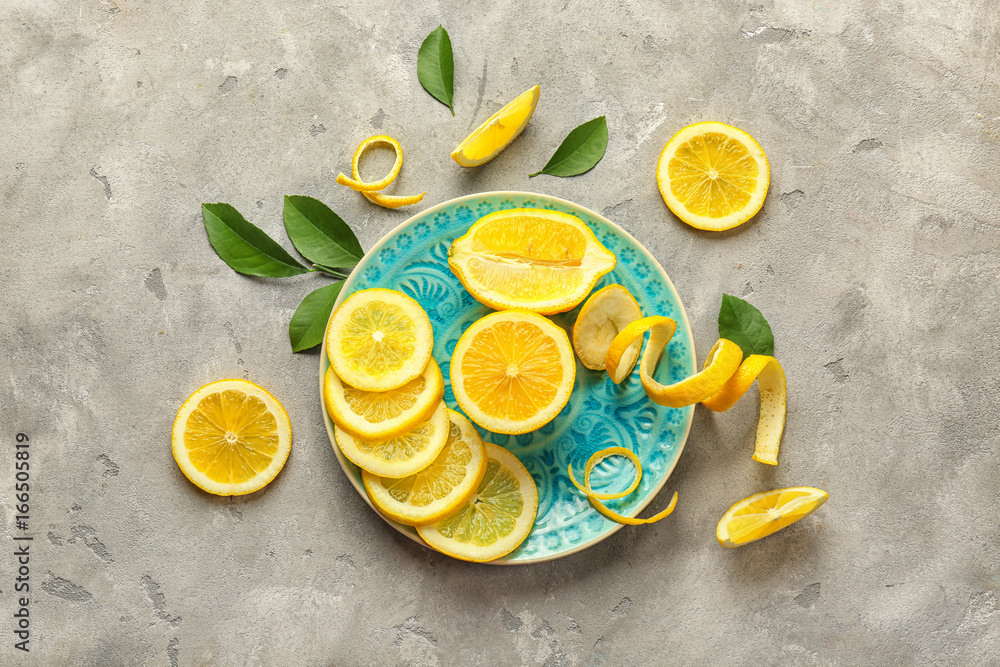Saucer with delicious sliced citrus fruit and lemon peel on grey background