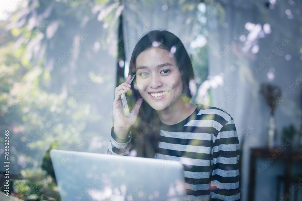 Asian women are using a telephone happily,Young people with life working in a coffee shop,Photo through the mirror with a reflection of the leaf.