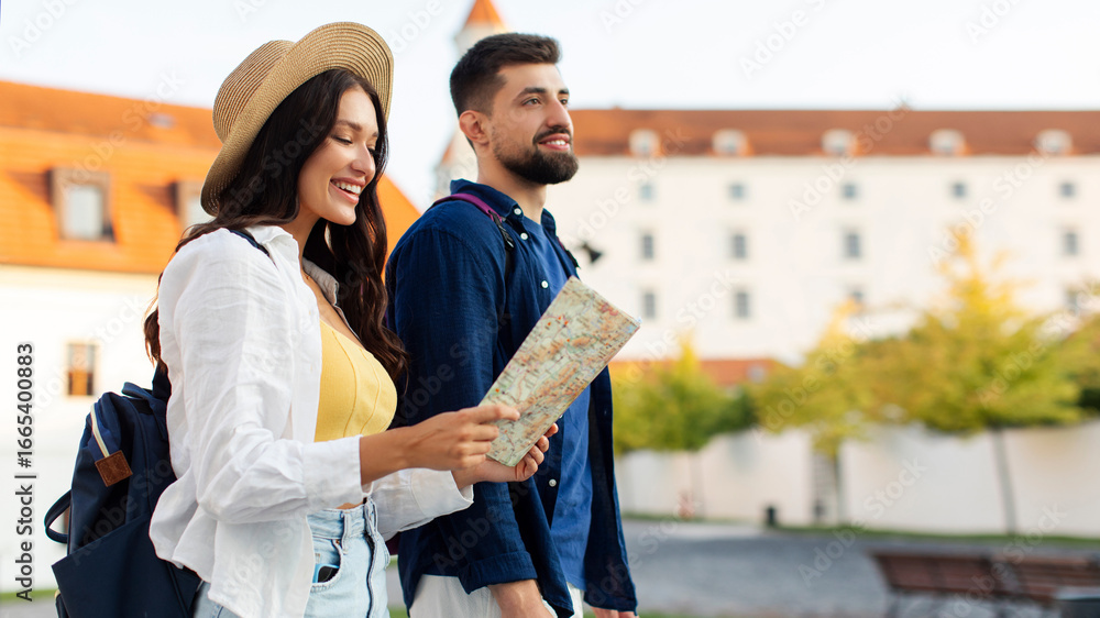 Young happy couple walking through old town, woman looking at map and searching route to landmarks while enjoying summer trip, free space