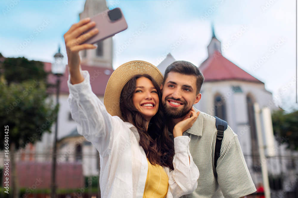 European couple in love taking selfie while walking and sightseeing city on sunny summer day, enjoying their vacation trip
