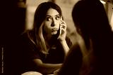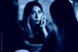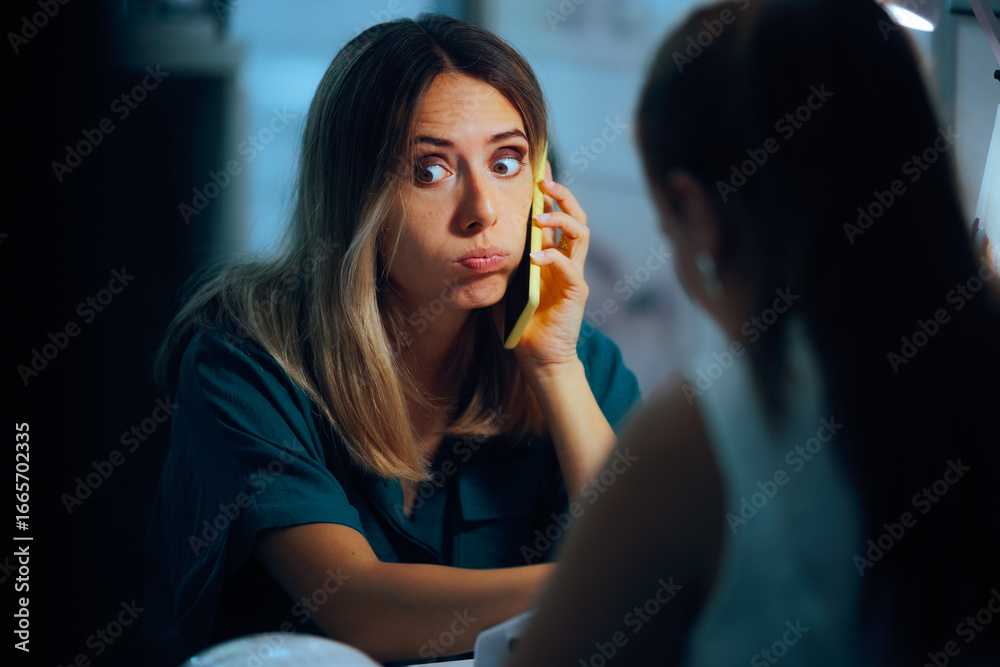 Puzzled Woman Speaking at the Phone art Manicure Salon. Lady feeling confused busy multitasking
