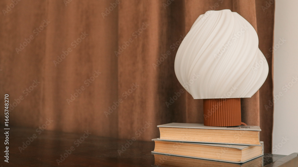 Modern decorative lamp with white sculptural shade placed on stacked vintage books, cozy and stylish home decor concept