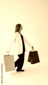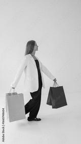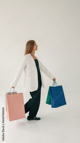 Stylish young woman walking with colorful shopping bags, smiling with confidence, minimal white background
