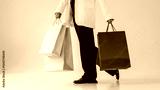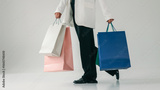 Close-up of elegant woman walking with shopping bags in hands, colorful retail and fashion concept on minimal background