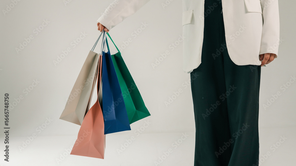 Close-up of woman’s hand holding multiple colorful shopping bags, minimal fashion and retail lifestyle concept