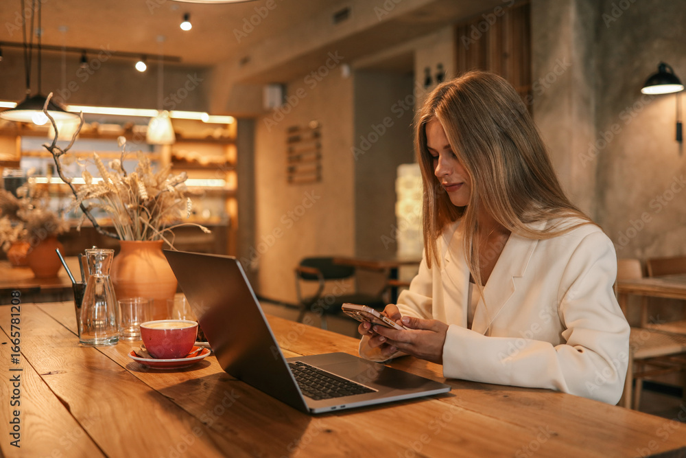Young woman in white blazer sitting at wooden cafй table with laptop and coffee cup, focused on using smartphone in cozy modern interior with warm lighting