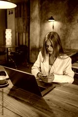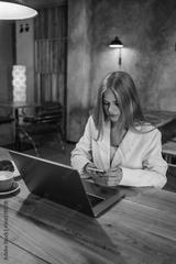 Young woman in white blazer sitting at wooden cafй table with laptop and coffee cup, focused on using smartphone in cozy modern interior with warm lighting