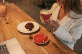 Close-up of woman in white blazer holding a red cup of cappuccino at wooden café table with chocolate pastry on a plate, cozy coffee break scene with warm atmosphere