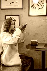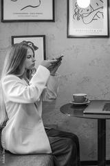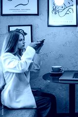 Young woman in white blazer using smartphone at café table with laptop and coffee cup, concept of modern lifestyle, online communication, and remote work