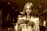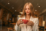 Young woman in light jacket holding red coffee cup while sitting at cafe table, thoughtful expression, cozy modern interior