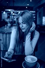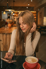 Young woman with long blonde hair using smartphone at cafe table, red coffee cup in foreground, modern cozy interior with warm lights