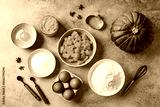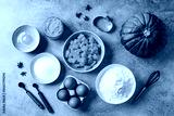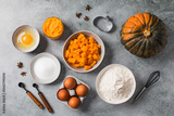 Baking ingredients for pumpkin pie prep on gray background. Autumn recipes.