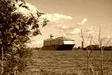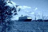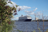 Luxury modern all inclusive cruiseship cruise ship liner Schiff 4 departure sail away from Hamburg HH port, Germany on River Elbe towards North Sea on sunny day seen from Elbstrand in Blankenese