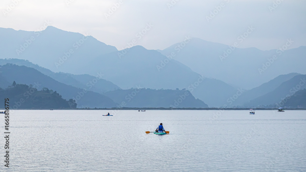 Peaceful view of Phewa Lake in Pokhara Nepal with kayakers and layers of misty Himalayan mountain ranges in the background