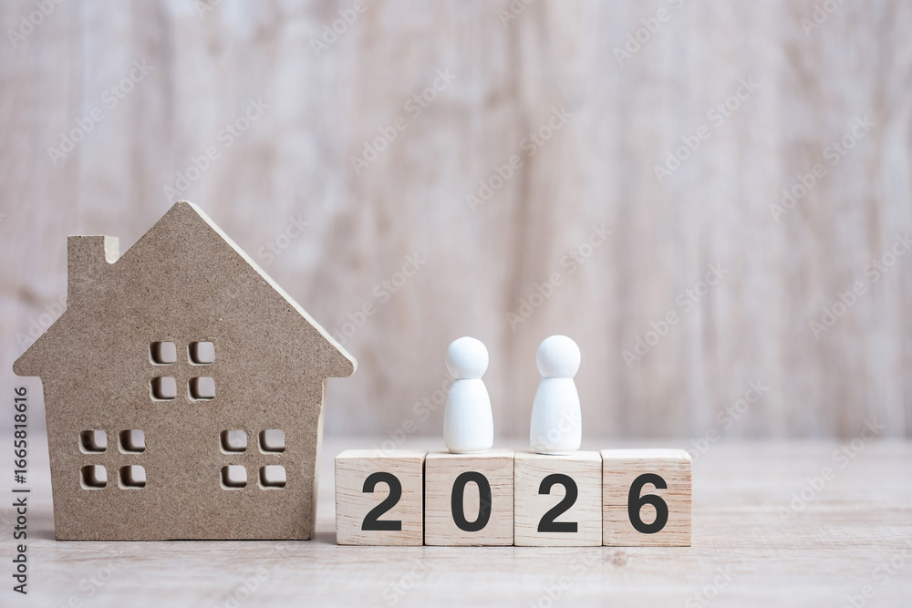 2026 Happy New Year with house model on table wooden background. Banking, real estate, investment, financial, savings and New Year Resolution concepts