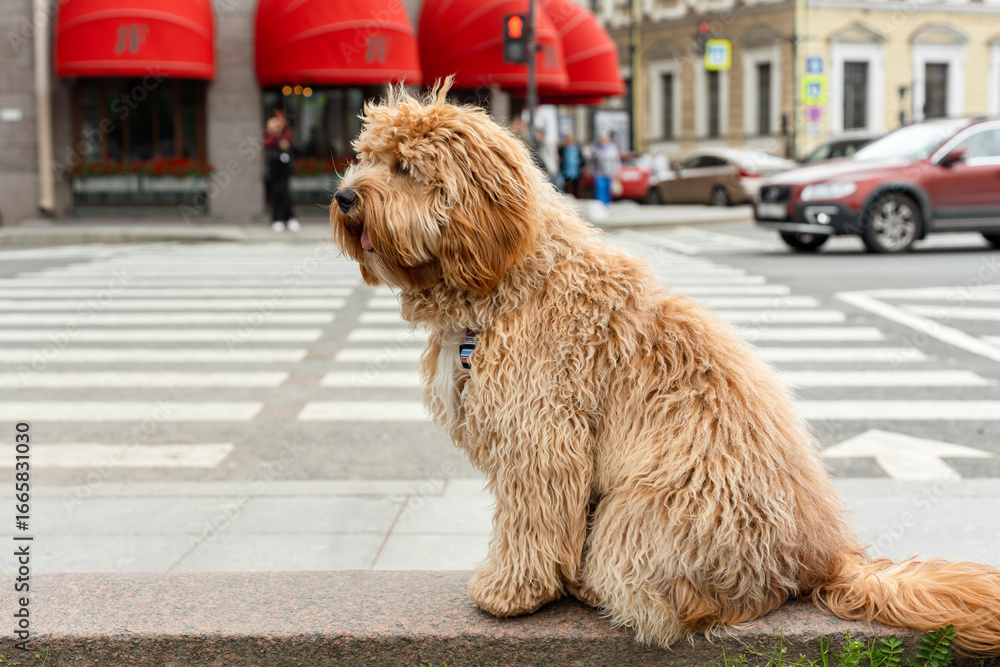 Curly brown dog on a beautiful street in St. Petersburg, tourist attractions