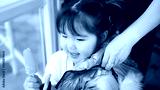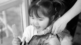 Close-up portrait of a happy Asian girl with a popsicle in her hand. Mom helps put a jacket on her little daughter while she eats ice cream