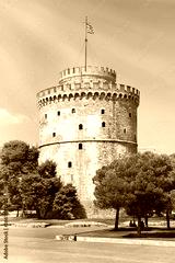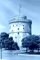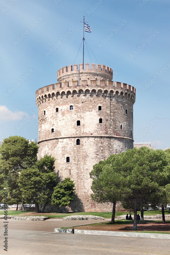 The historic White Tower of Thessaloniki, a famous landmark and symbol of the city on a sunny summer day, Central Macedonia, Greece. Travel destination and iconic monument against blue sky