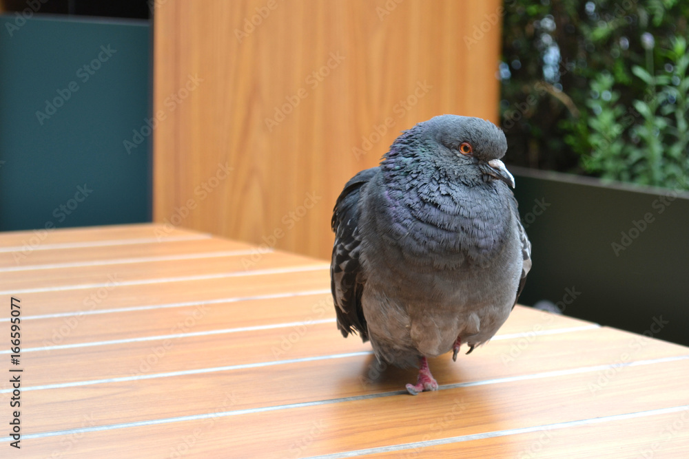 A lonely wild pigeon stands on a wooden table
