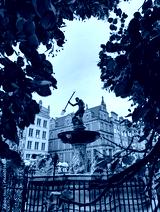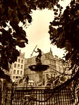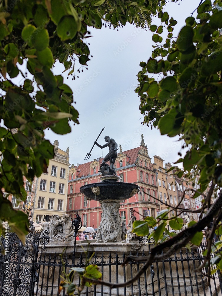 Beautiful fountain with statue of a man holding a trident in Gdansk, Poland surrounded by historic architecture