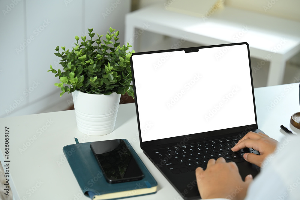 Close up of hands typing on laptop with smartphone, notebook, and potted plant on desk