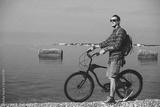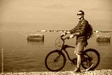 Young Male Cyclist With Bicycle Walking On Coast And Enjoying View Of Sea. Holiday Travel Activity Concept