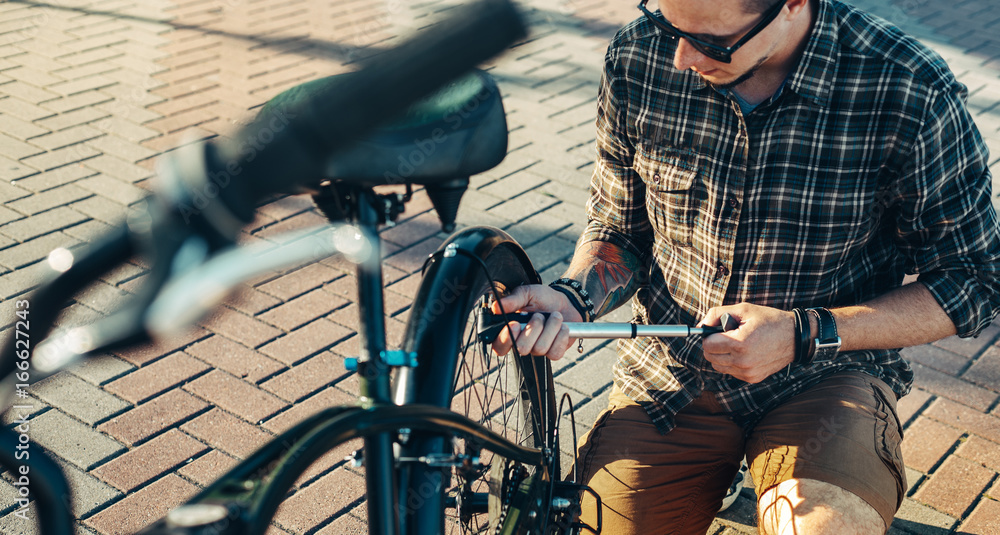 Young Man Cyclist Pumping Wheel Bike, Preparing For Trip, Maintenance Transport Concept