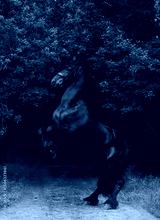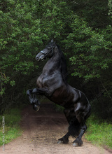 Beautiful black wild horse rearing up in nature background