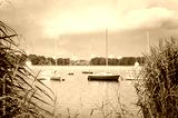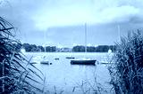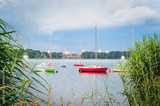 Boats on the water. Colorful boats on the urban lake with buildings in the background.