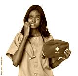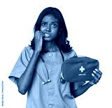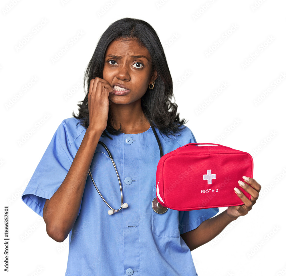 Young Indian nurse with first aid kit biting fingernails, nervous and very anxious.