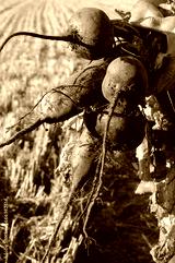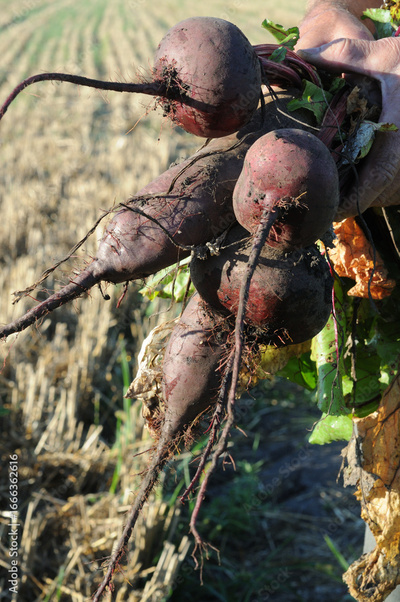 Freshly harvested beets in the field in the hands of a farmer, close-up photo