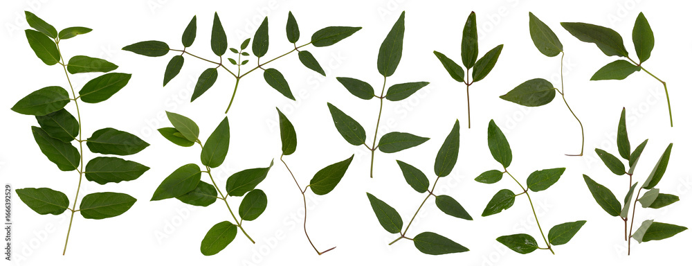 png isolated individually on transparent background set of green leaves and twigs of clematis