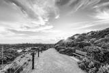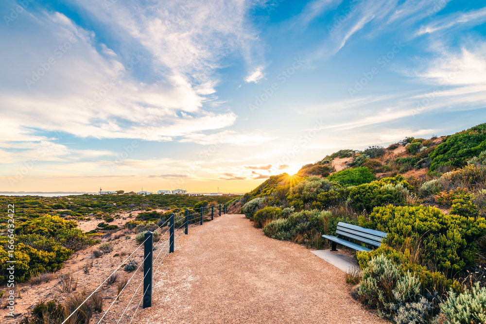 Robe coastal trail with bench viewed along Limestone Coast during sunrise, Guichen Bay, South Australia