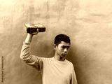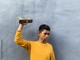 A young man is poised to strike with a block of stone, capturing a menacing act of violence and the threat of bullying