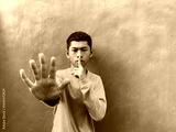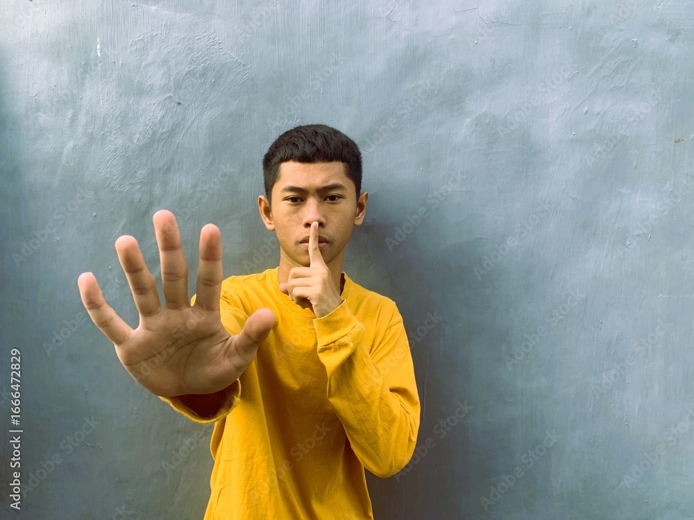 An Asian man in a yellow t-shirt makes a stop gesture with an open palm, indicating a halt or refusal, gray background, copy space