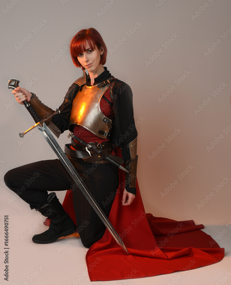 portrait of Fantasy warrior woman model, holding sword weapon, historical medieval armour costume with red fairytale cloak, strong fantasy knight. sitting kneeling pose isolated on studio background