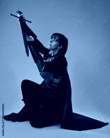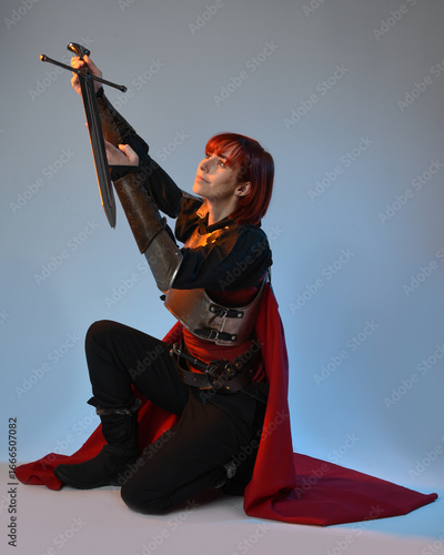Fantasy warrior woman model wearing historical medieval armour costume, red fairytale cloak, cinematic portrait of strong fantasy knight. kneeling pose holding sword, studio background.