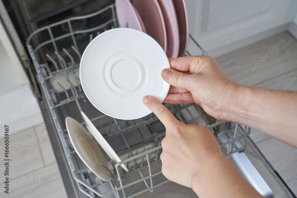Caucasian adult female loading dishwasher with saucer in modern kitchen setting.