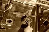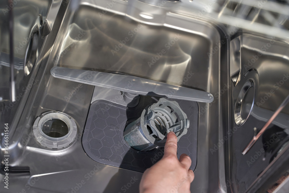 Female hand cleaning stainless steel dishwasher filter inside open appliance.