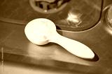 White scoop filled with lye pellets on stainless steel sink surface in kitchen setting.