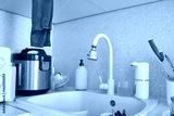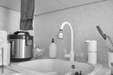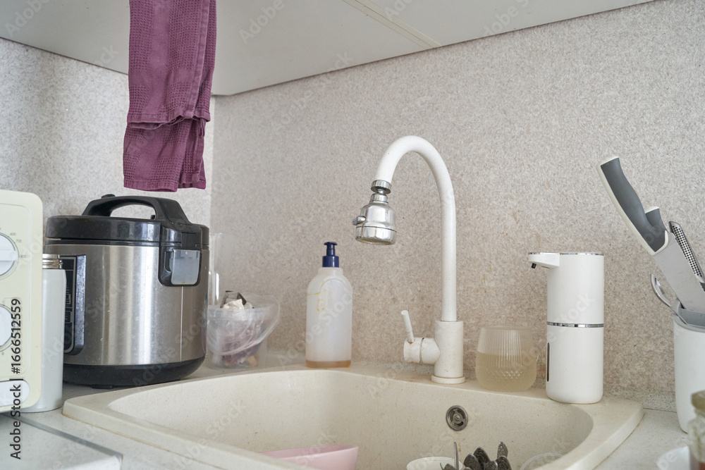 White kitchen sink with faucet and nearby appliances including rice cooker and soap dispenser.