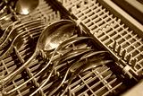 Close up of clean stainless steel spoons loaded in dishwasher cutlery tray for kitchen organization.